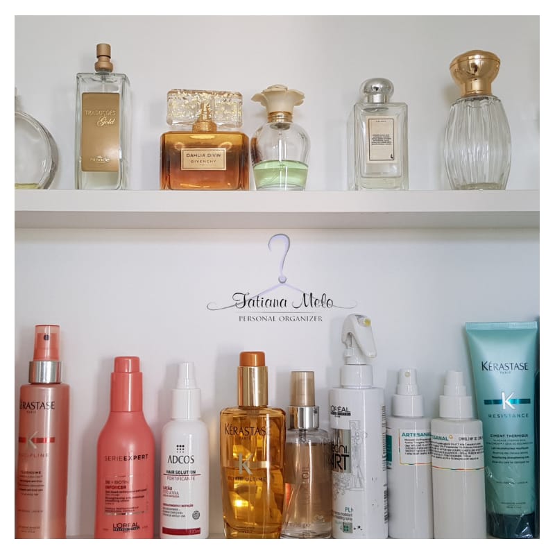 Existem três produtos que deveriam ser guardados em outro local fora do banheiro, estes produtos são: maquiagem, medicamentos e perfumes. Todos sofrem com a oscilação de temperatura e também com a umidade, mas eu sei, calma. Eu entendo que muitas vezes não existe outra opção, neste caso, sugiro guardar dentro de armários ou dentro de organizadores com tampa. Agora se o banheiro é maior, uma solução é também utilizar a bancada com organizadores de acrílico.